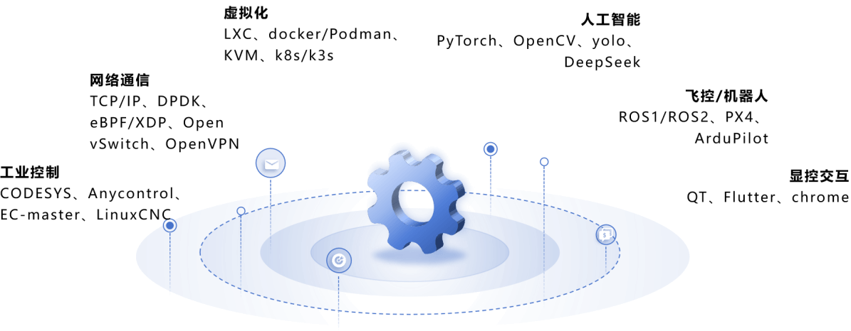 望获实时 Linux 拥有强大的行业中间件支持,涵盖工业控制、网络通信、虚拟化、人工智能、飞控 / 机器人及显控交互等多领域核心技术,如 CODESYS、AnyControl、Docker、Pytorch、ROS、EtherCAT 与 Qt 等,为实时应用提供全面支撑。